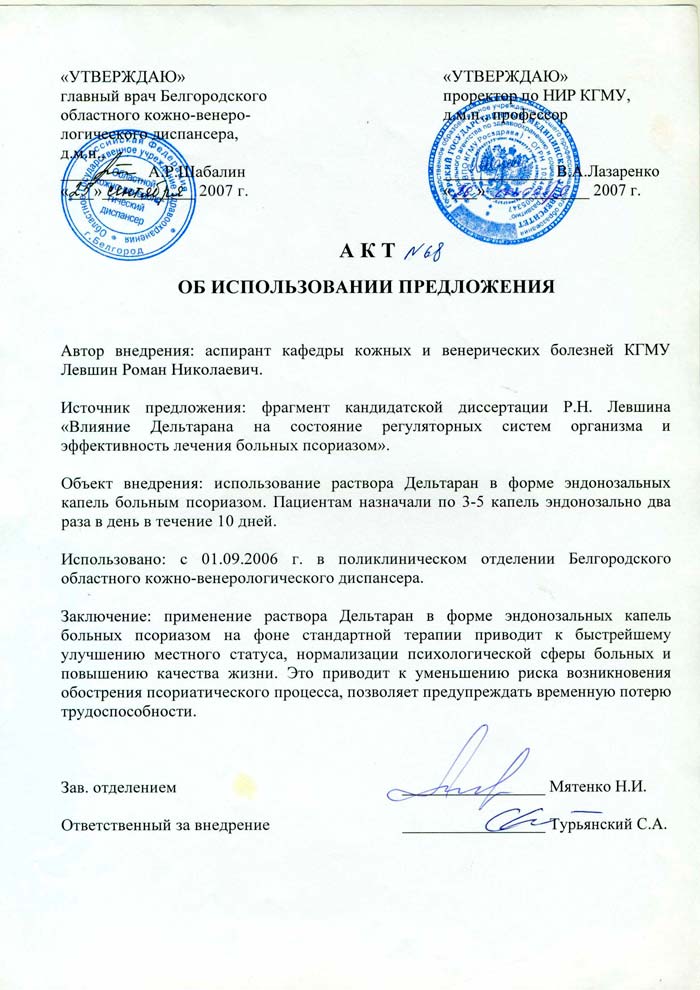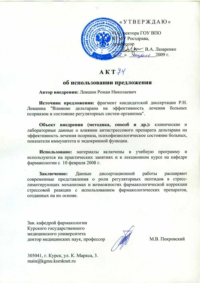 Высокая научно-практическая значимость и эффективность предложенной Лёвшиным Р.Н. методики отражена в многочисленных отзывах ведущих медицинских вузов страны, в лице: зав. кафедрой патофизиологии Московской медицинской академии им. И.М. Сеченова,член-корр.РАМН, д.м.н.,профессора П.Ф. Литвицкого, зав. кафедрой клинической фармакологии ГОУ ВПО Российский государственный медицинский университет Росздрава, член-корр. РАМН,д.м.н.,профессора Ю.Б. Белоусова, зав. кафедрой дерматовенерологии Воронежской государственной медицинской академии им. Н.Н. Бурденко, д.м.н. профессора Л.А. Новиковой, зав. кафедрой фармакологии и биохимии ГОУ ВПО «Орловский государственный университет» к. б. н., доцента А.В. Лебедева, зав. кафедрой биохимии и фармакологии «Белгородский государственный университет» д.б.н.,профессораА.А.Шапошникова.