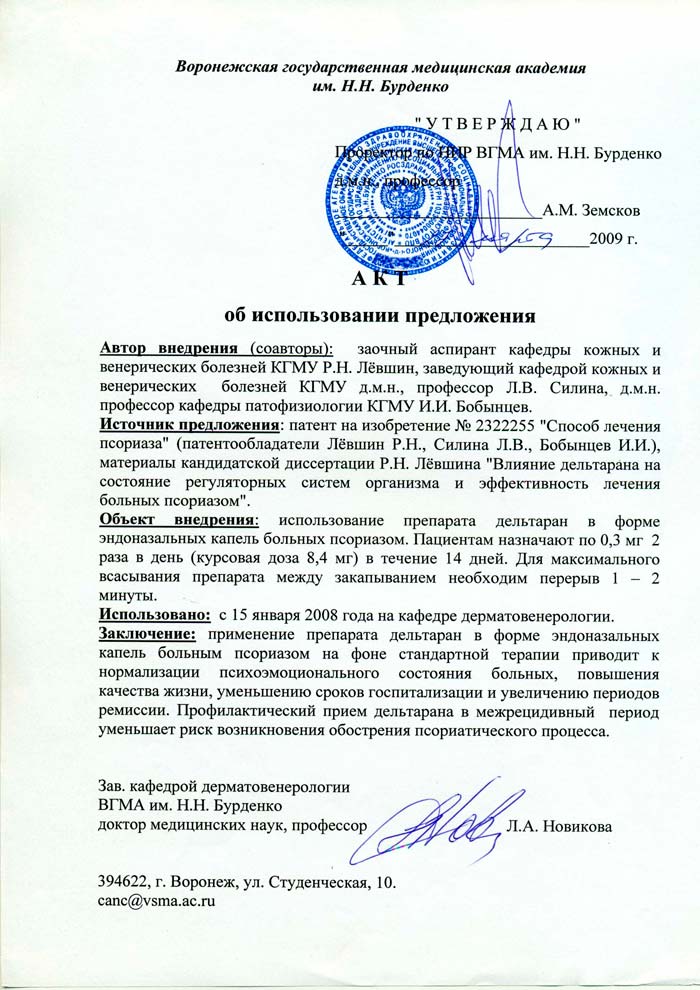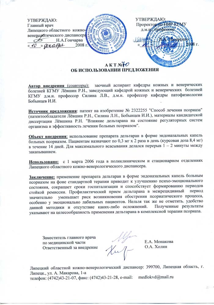 В апреле 2008 года получен патент на изобретение: «способ лечения псориаза» № 2322255. Запатентованная методика лечения и профилактики псориаза используется в работе Курского, Воронежского, Белгородского, Липецкого кожно-венерологических диспансеров. По результатам четырёхлетних исследований, в 2009 году успешно состоялась защита диссертации на соискание учёной степени кандидата медицинских наук. Тема диссертации: « Влияние дельтарана на эффективность лечения больных псориазом и состояние регуляторных систем организма». Выполненные исследования показали значительное повышение эффективности лечения псориаза при применении дельтарана у больных с триггерными стрессовыми факторами в сочетании с традиционной терапией. Использование монотерапии препаратом в межрецидивный период активно препятствует обострению заболевания. Материалы диссертации вошли в учебные рабочие программы и используются в лекционных курсах и на практических занятиях ряда кафедр Курского государственного медицинского университета и Воронежской государственной медицинской академии им. Н.Н. Бурденко (акты практического внедрения нового метода лечения прилагаются).